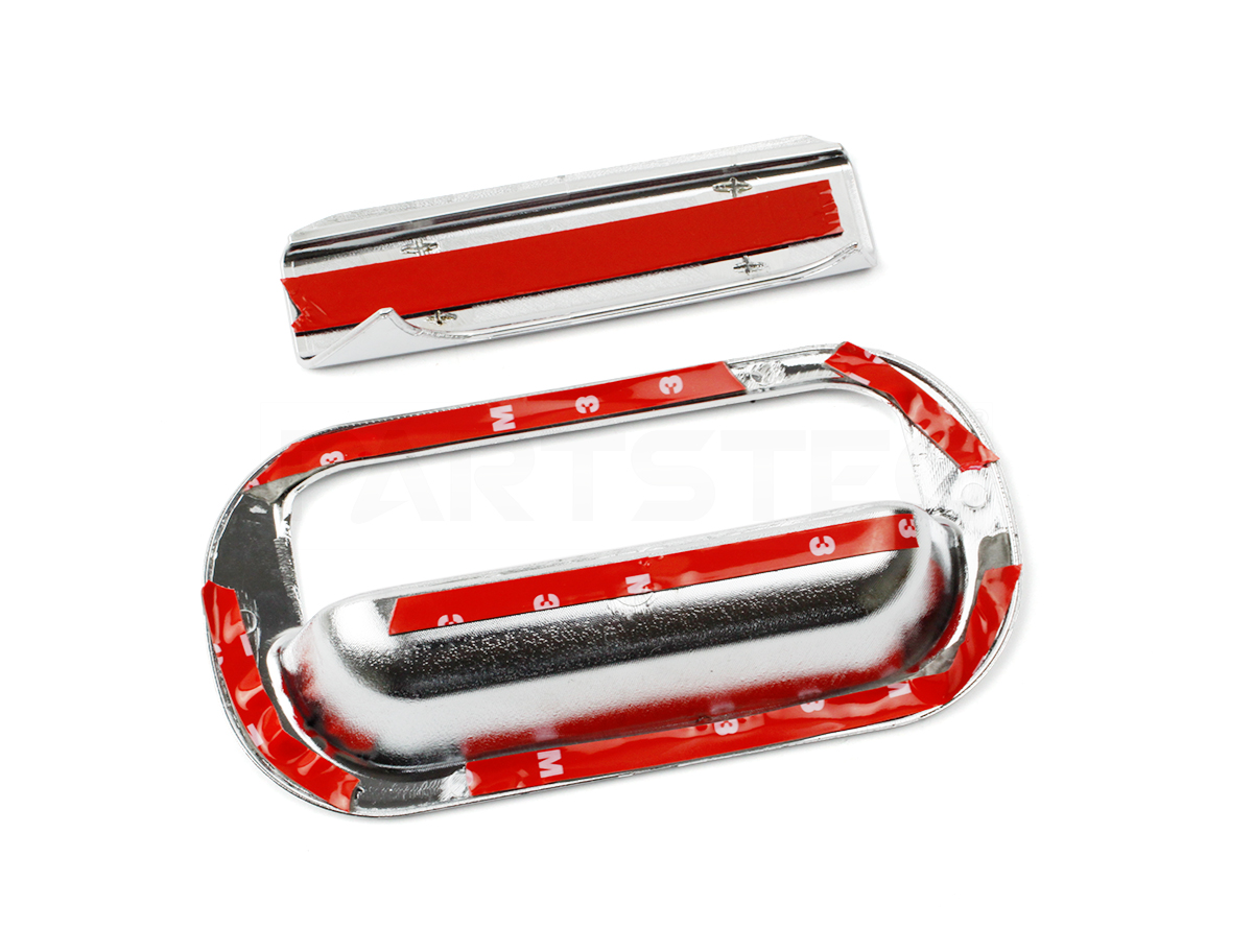 三菱ふそうNEWキャンター用のメッキドアグリップカバー左右セットです。裏面には両面テープ施工済みですので脱脂の上貼り付けるだけで簡単に装着できます。クロームメッキの光沢でサイドビューの高級感を演出できる商品です。