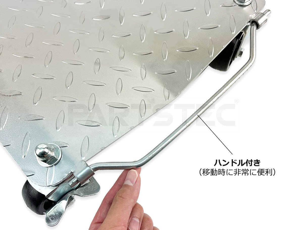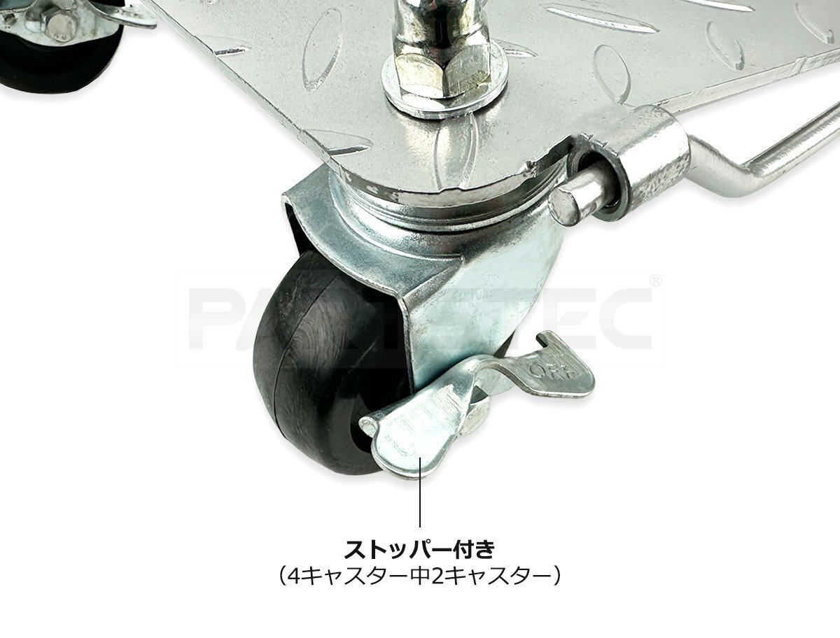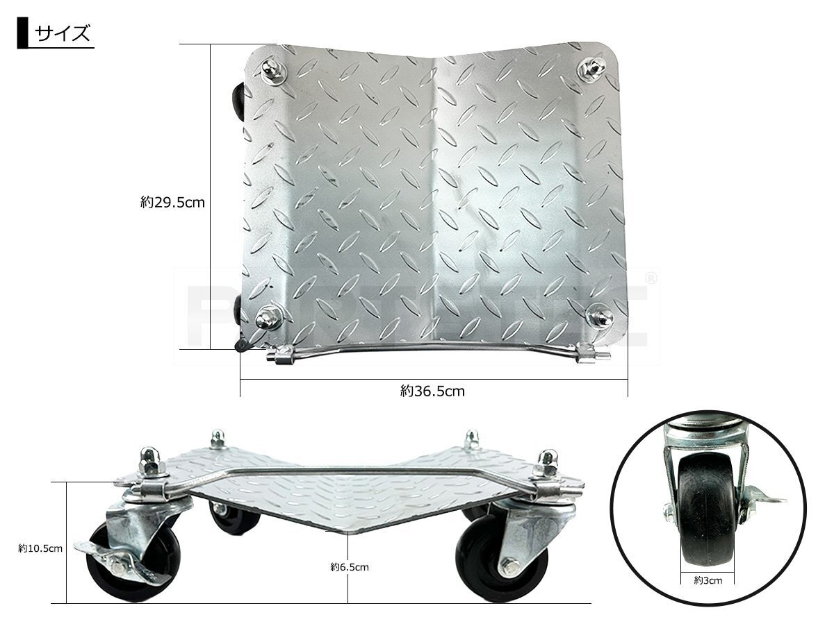 事故車や不動車の移動作業に最適なタイヤドーリーです。全てのキャスターが自在式で、うち2個はブレーキ付きです。前輪・後輪にセットして狭い場所でも自由自在に車両移動が可能ですので、ハンドル操作は不要です。コンパクトかつ軽量設計で、持ち運びもラクラクです。
