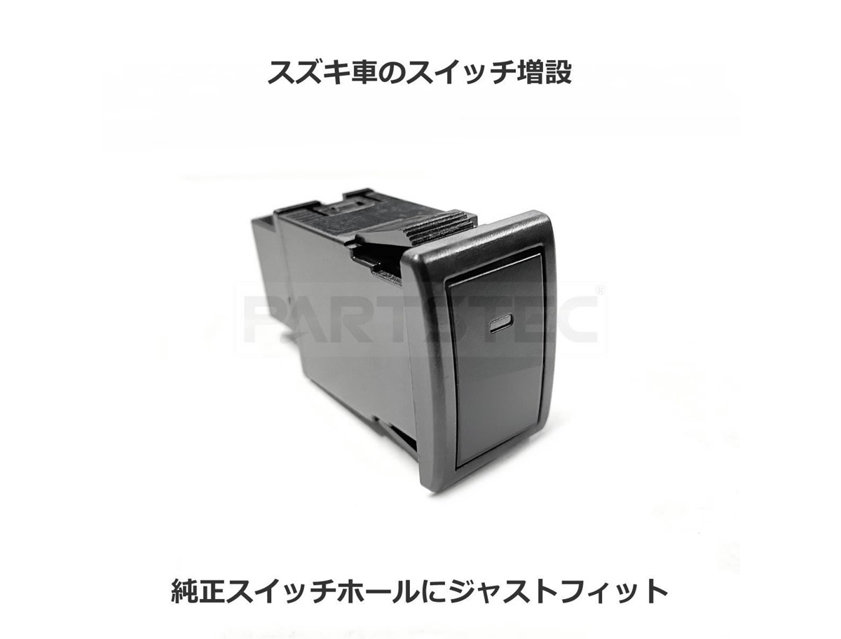 スズキ車の純正スイッチホールになります。後付感や違和感がほとんど無くジャストフィットします。ポジションランプ/CCFL/バックフォグ/リフレクター 等々 のさまざまな後付けライト系の ON/OFF スイッチに最適です。LEDインジケーター発光によりON/OFF 状態が一目瞭然です。純正に採用されているプッシュ式のオルタネイト動作スイッチとなっています。LED発光色は、スイッチONでインジケーターがグリーン発光となります。