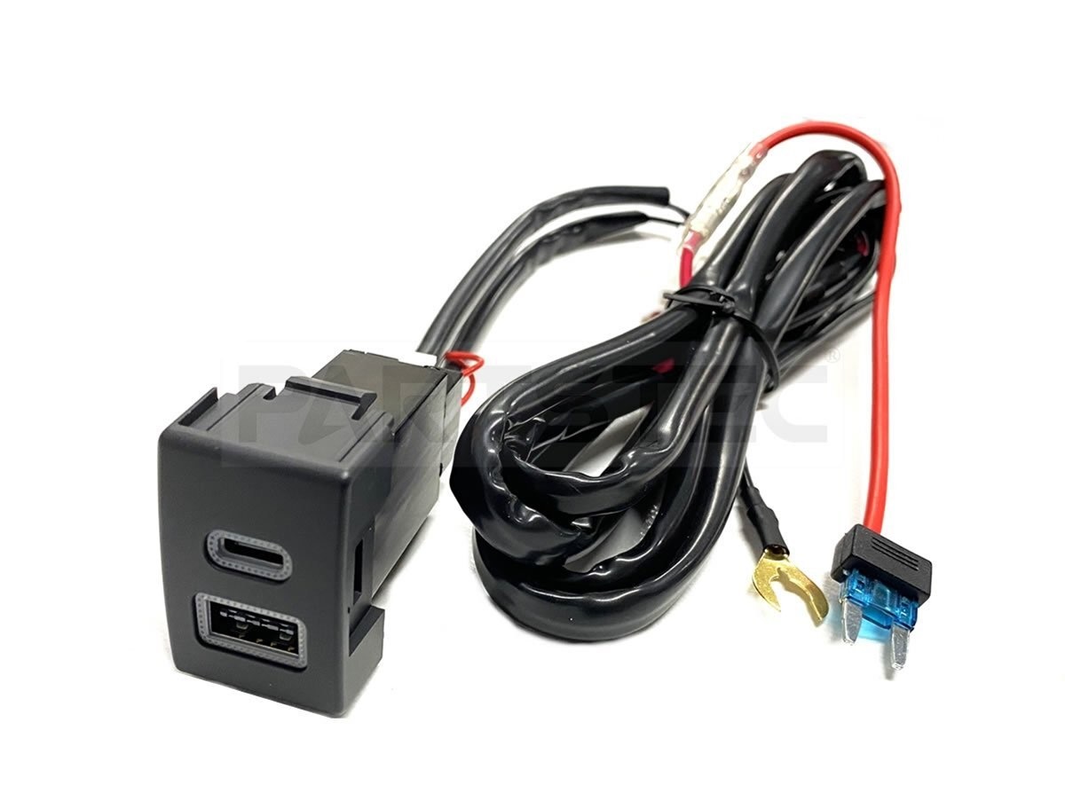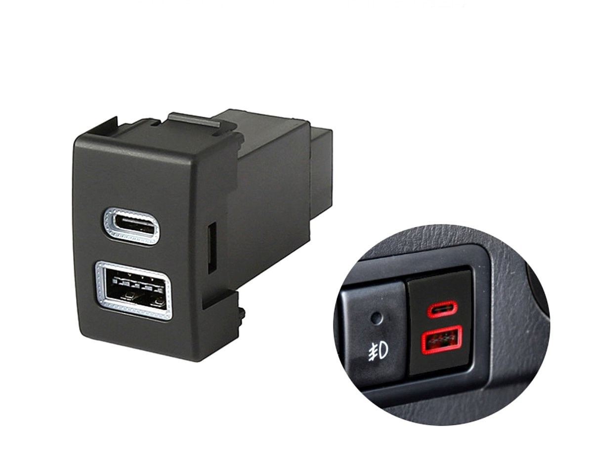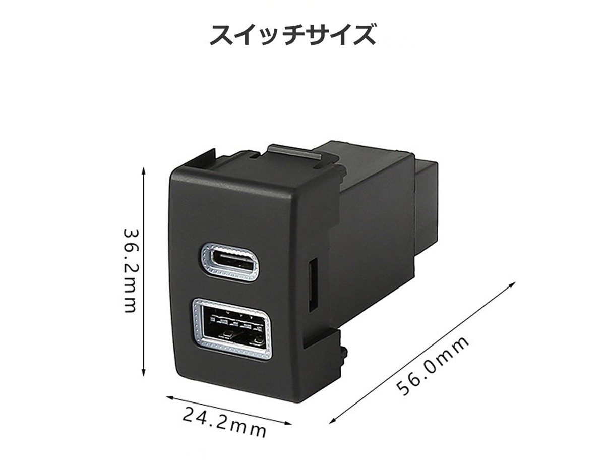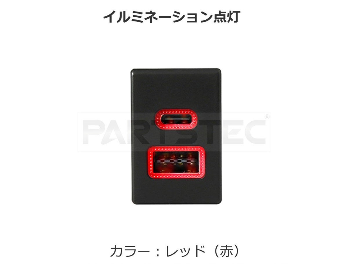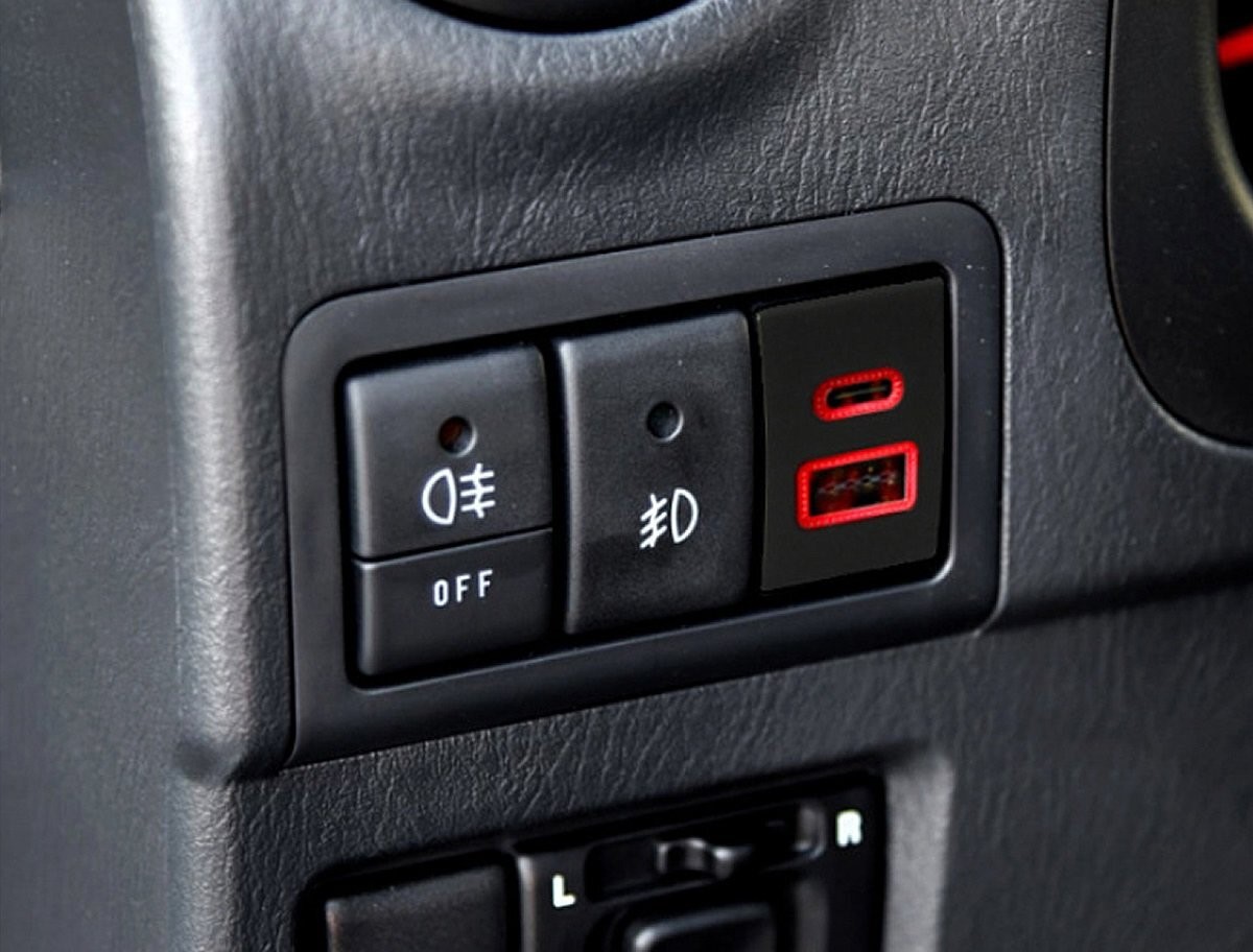スズキ ジムニーJB23純正サイズで純正スイッチパネルと交換しても違和感なくフィットします。スマートフォンやタブレットの充電に! 通常のUSBタイプAだけでなく、iPhone、iPadにも対応したタイプC充電ポートも搭載しています。純正スイッチパネルと交換して違和感無くすっきり収まります。LED搭載で通電している時はレッドのLEDが点灯します。もしもの時の過電流防止ヒューズも搭載しており、安全にご使用できます。