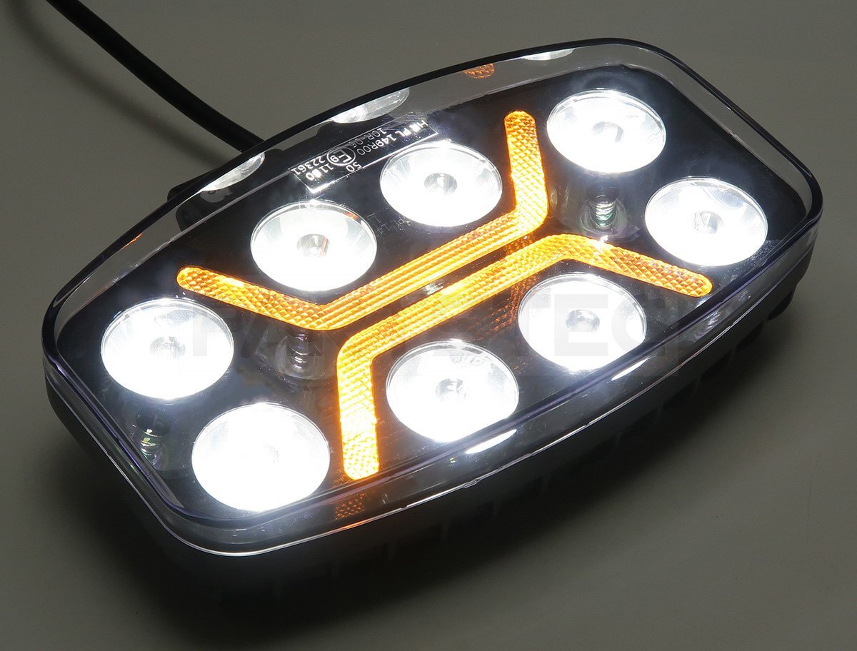 12V/24V(10~30V対応)両方で使用できるLEDライトセットです。1ライトユニットに高輝度LEDチップを8個も内蔵しています。ライトセンターライン部(ホワイト/アンバー両方共)は初回は流れる点灯でドレスアップ効果抜群です。安心してご使用いただけるEマーク付きアイテムです。