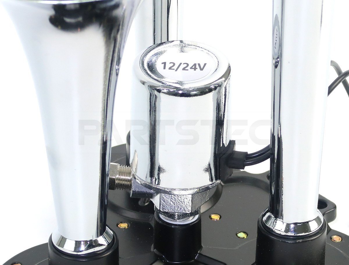 長さ約165mm/230mm/295mmタイプの3連ヤンキーホーンです。クロームメッキでドレスアップ効果も抜群です。12V/24V兼用で、幅広い車種に対応しています。
