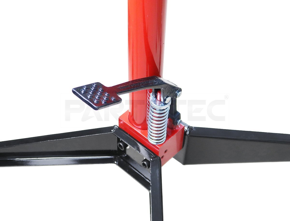 最大荷重 0.5トン(500kg)の高耐久仕様で、幅広い車両のミッション脱着作業に対応した油圧式ミッションジャッキになります。最大リフト高さ約1990mmのハイリフトアップジャッキです。ハンドル動かすことで、ミッションに合わせて簡単に角度調整可能です。フットペダル式油圧ポンプにより、両手が塞がっている状態でも安全に昇降操作が可能です。鋳鉄製四輪キャスター付きで移動しやすく、整備現場での取り回しがスムーズです
