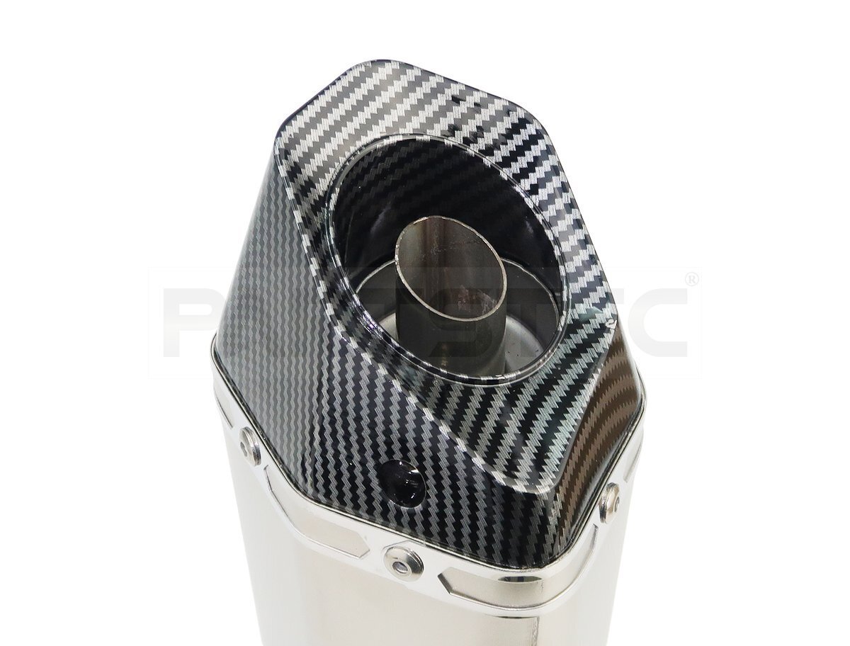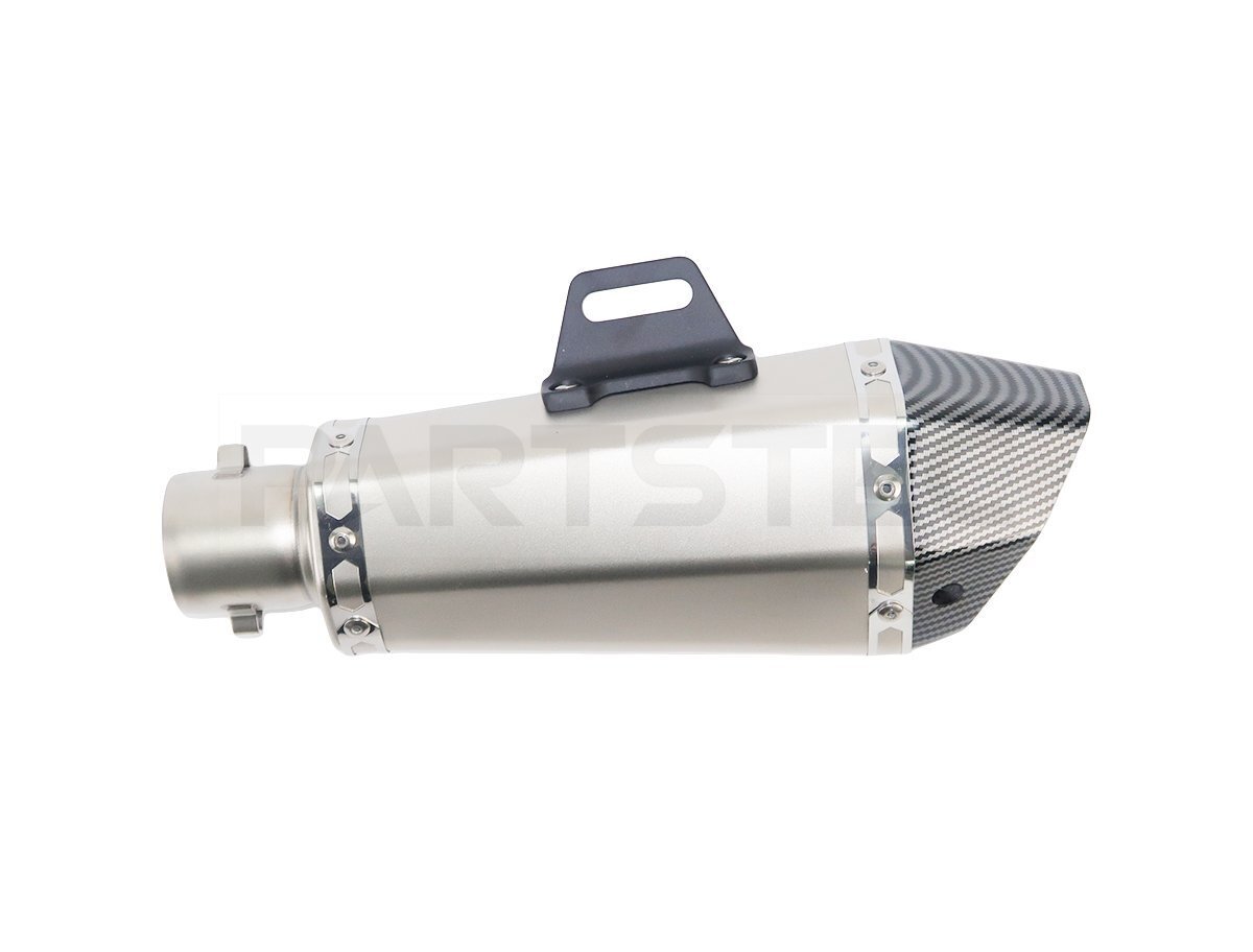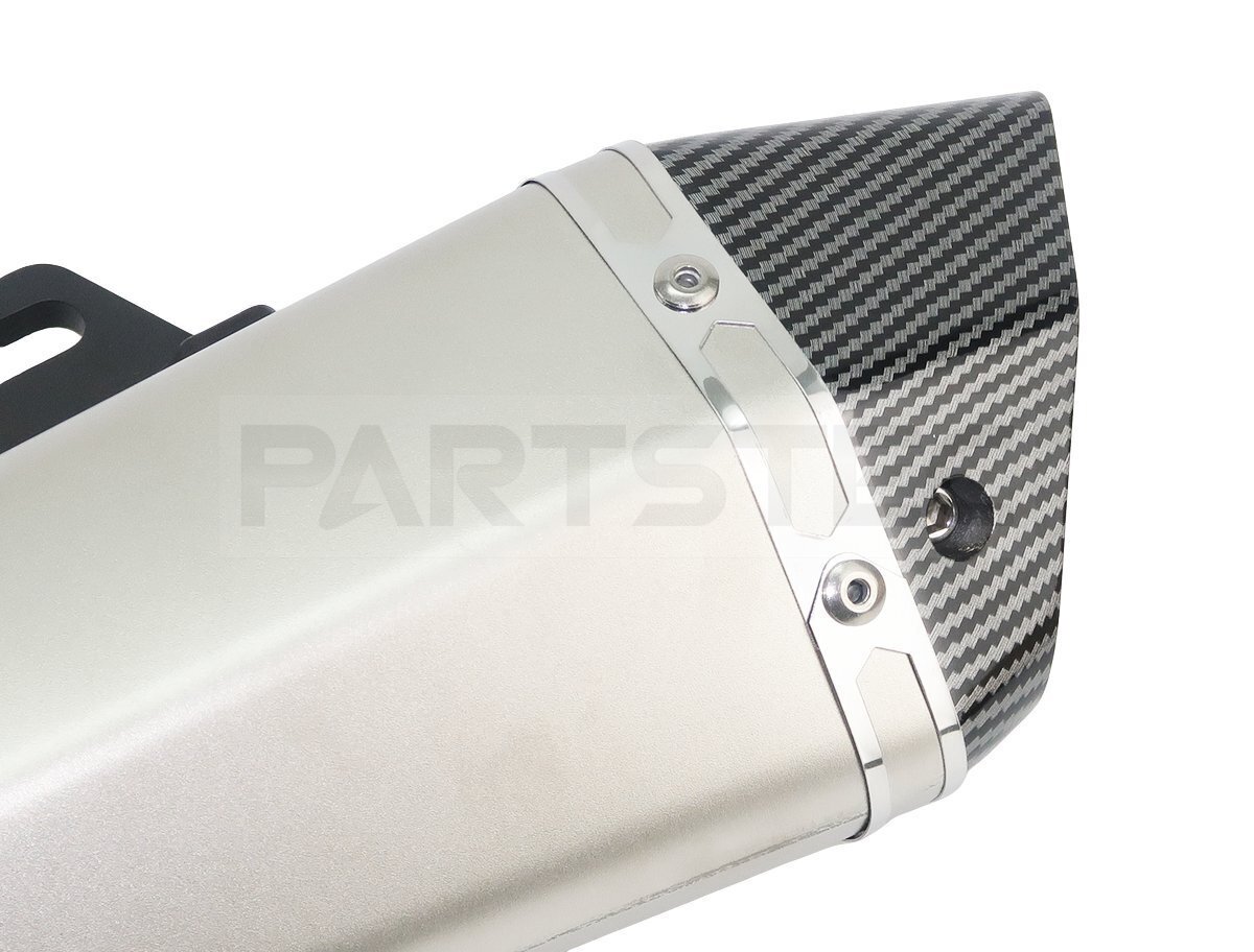 汎用バイク用 サイレンサーカーボン調エンドです。スタイリッシュなカーボン調デザインと金属ボディを採用し、マフラー周りのカスタム・ドレスアップに最適な汎用サイレンサーとなります。スリップオンタイプのため、差込径が合えばさまざまな車種へ装着可能で、50cc~125ccクラスを中心に幅広く対応します。外観カスタムを重視したい方や、純正マフラーからのイメージチェンジにもおすすめです。