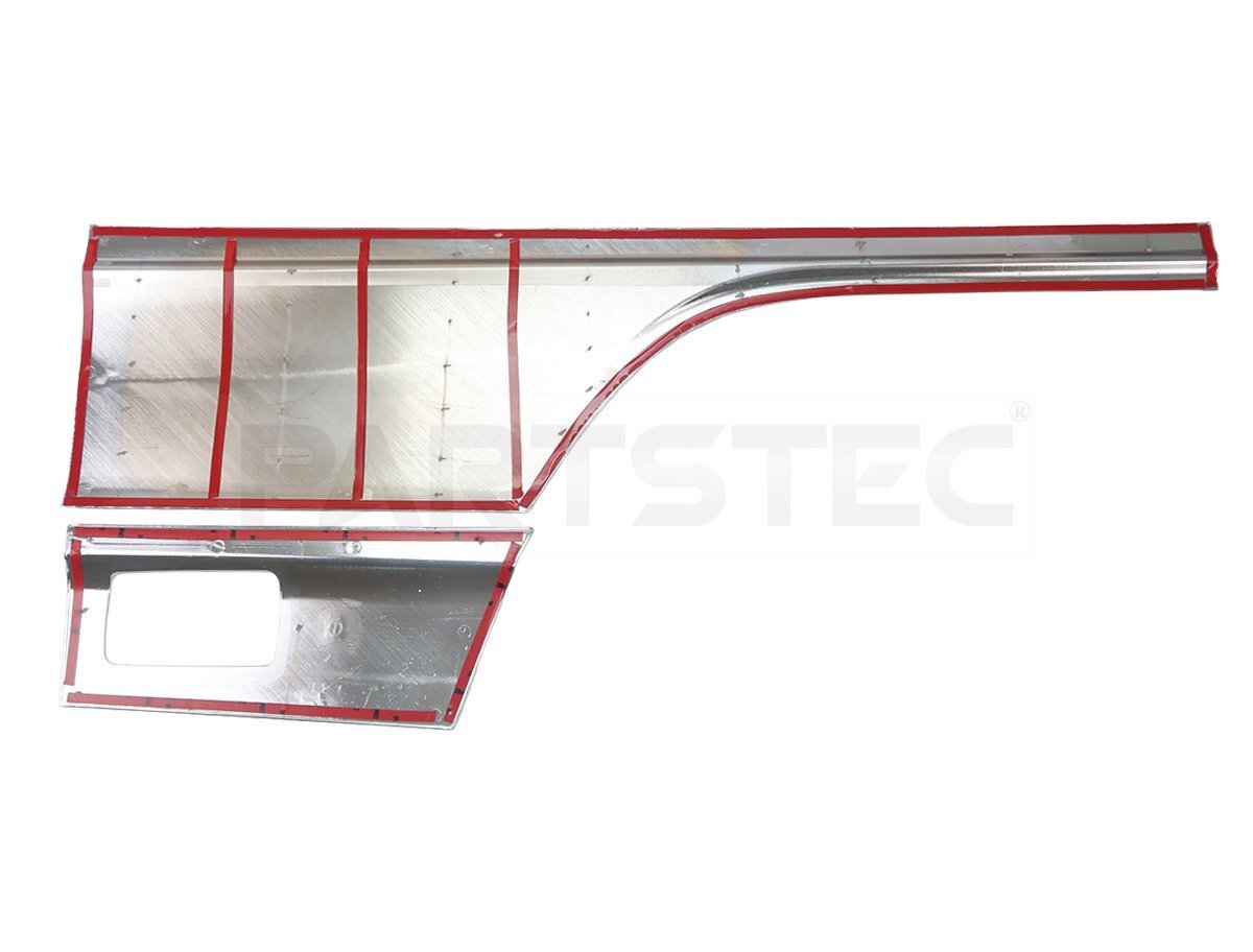 07エルフ用メッキドアガーニッシュのセットです。両面テープ施工済みですので、貼り付けるだけで簡単に取付けできます。サイドビューの高級感を演出します。