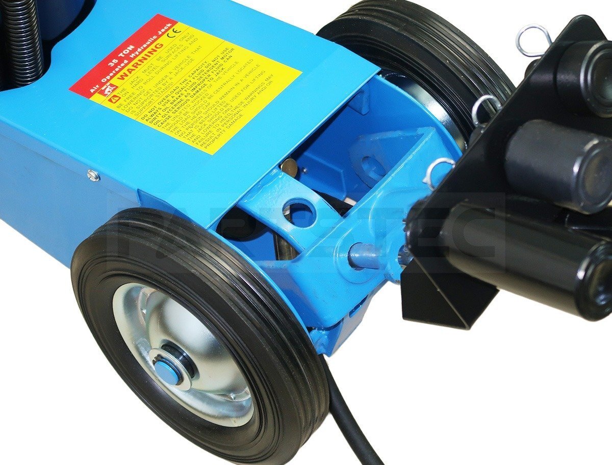 エアー駆動式35トン油圧ジャッキです。大型トラックまで対応できるパワフルな1台です。エアーポンプで楽にジャッキアップ。手動操作不要で作業効率が大幅にアップします。3種類のアタッチメント+調整ネジ付きで、様々なジャッキポイントの高さに対応します。ハンドルは3段階調節可能。軽量コンパクト設計で取り回しも楽々です。