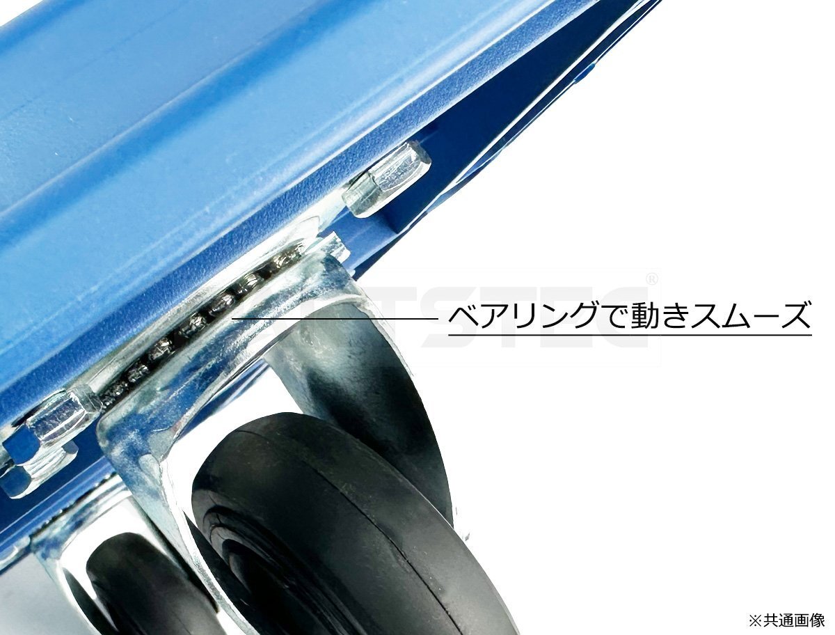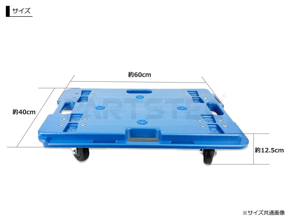 60×40cmの業務用平台車です。倉庫・工場・引越しなど幅広い用途に活躍します。連結対応で複数台をつなげて大型荷物の運搬も楽々!360°回転キャスターで移動がしやすいのはもちろん、超静音キャスター採用しています。1台150kgの高荷重設計。本体わずか2.7kgで軽量・取り回し抜群です。